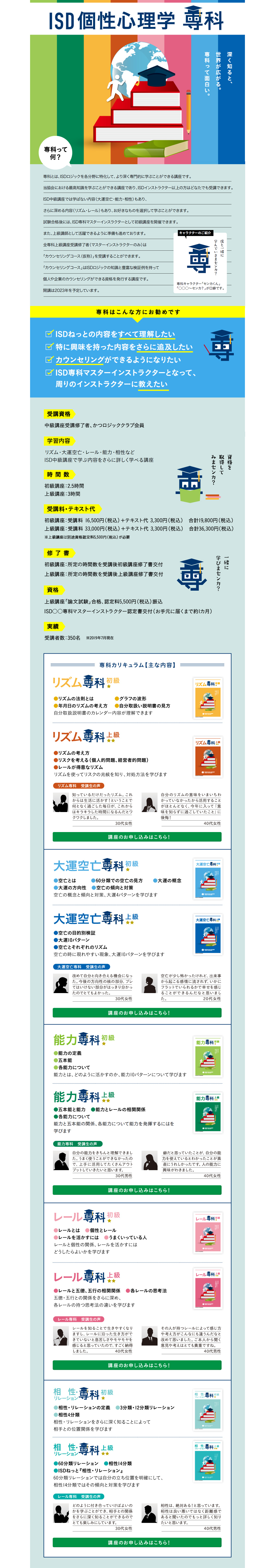 | 専科内容 | ISD個性心理学の相性・リレーション専科講座(上級) ~相性・リレーション専科とは~ 初級では 相性とはどんなものか? 合う・合わないではなく、距離感で検証することを学ばれたとおもいます 上級講座では 60分類リレーション 相性14分類 ISDネット「相性リレーション」 現在の置かれた人間関係を相性で検証することで、見方・立ち位置がわかり、コムにケーションの取り方もかわっていくかもです また今から出会う未来の人のためにも是非この知識をいかしてよりよい人生にしていきましょう 相性・リレーション専科講座(上級) 会場 ZOOMオンライン 講師 森田 幸枝 受講料 上級 36300円 (再受講 3300円) *別途資格認定料 5000円(税別) 対象者 ISDインストラクター (ロジッククラブ会員) 相性・リレーション専科初級講座 受講修了者 *専科初級講座受講希望の方は各支部長にお問い合わせください 支部長が不明な場合はSMSメッセージで本部へお問い合わせください ●受講したいけど 上記の日程 都合が合わない方 その他 お問い合わせは aiminoie@gmail.com 森田まで |